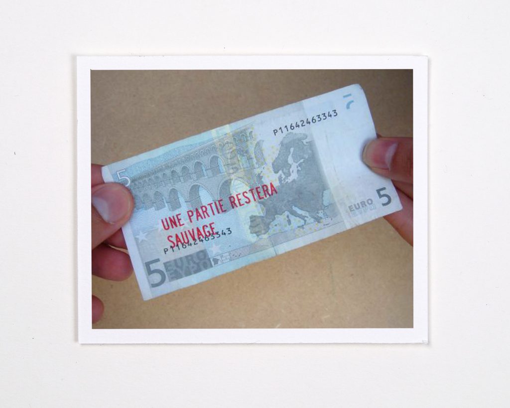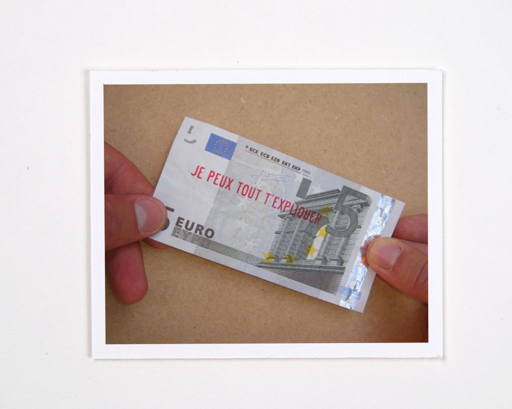 Cette œuvre fait partie du projet « Motney », pour lequel j’ai invité 25 autres auteur.e.s à inventer une phrase à imprimer sur un billet de banque.