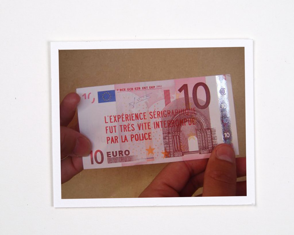 Une phrase est sérigraphiée gratuitement sur les billets de banque des passant.e.s. Au terme de l’échange, soit la personne garde le billet, qui sort du circuit financier, soit elle le remet en circulation, lui donnant ainsi de nouveaux lecteurs.