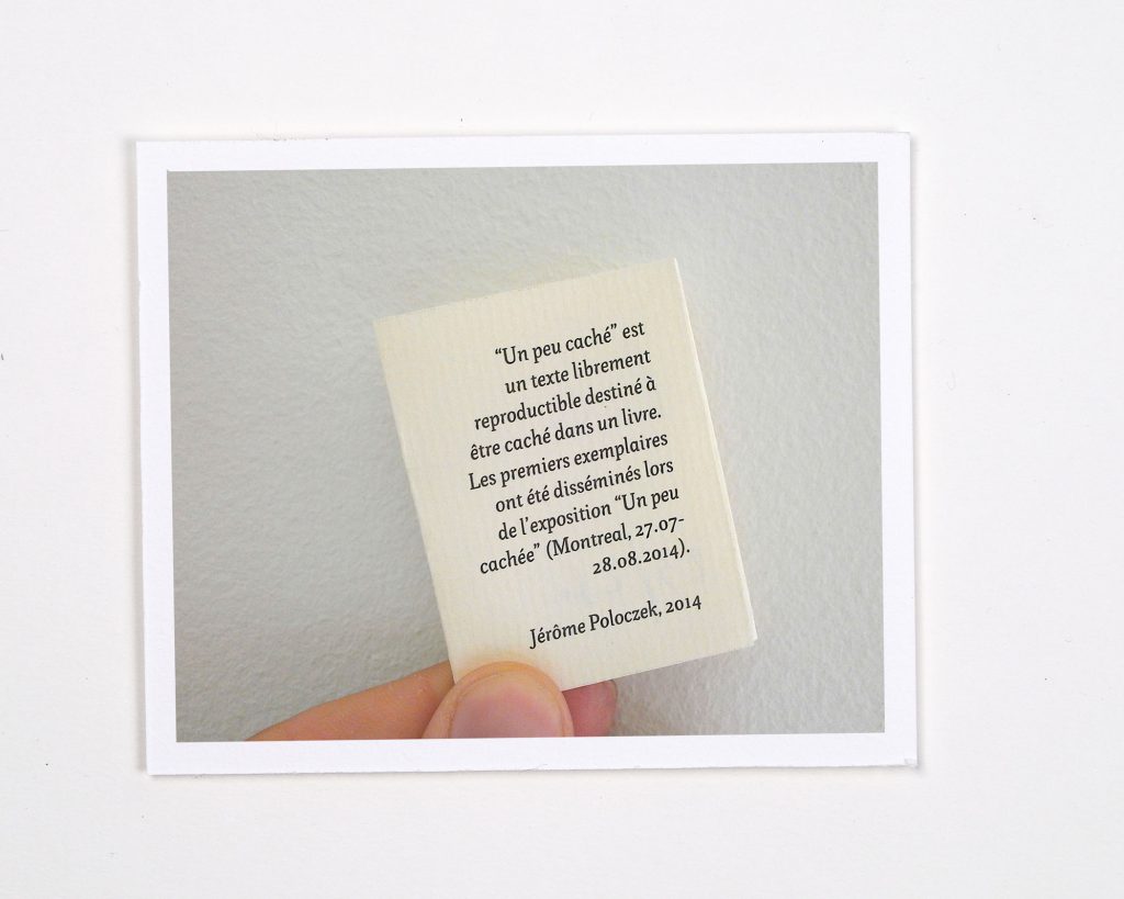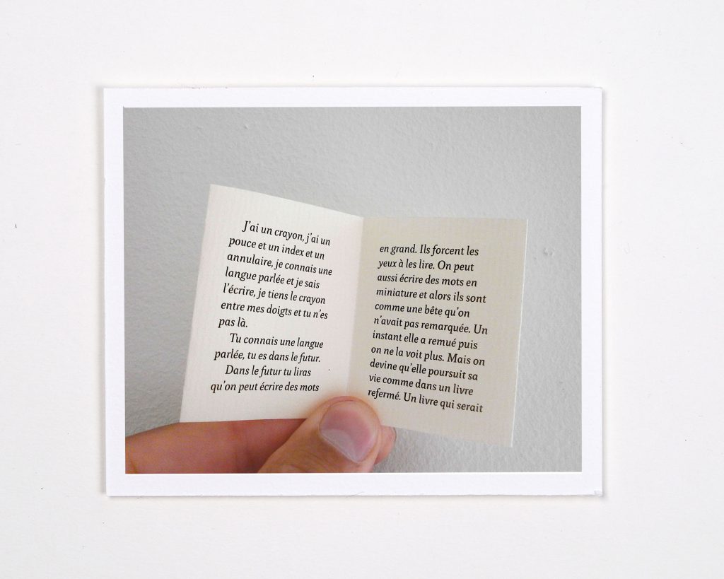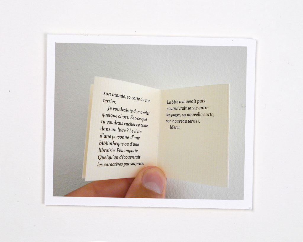 Un livre miniature est destiné à être caché dans un livre. C’est une « littérature virale » : le texte s’immisce dans un autre livre et peut être colporté de personne en personne, d’ouvrage en ouvrage.