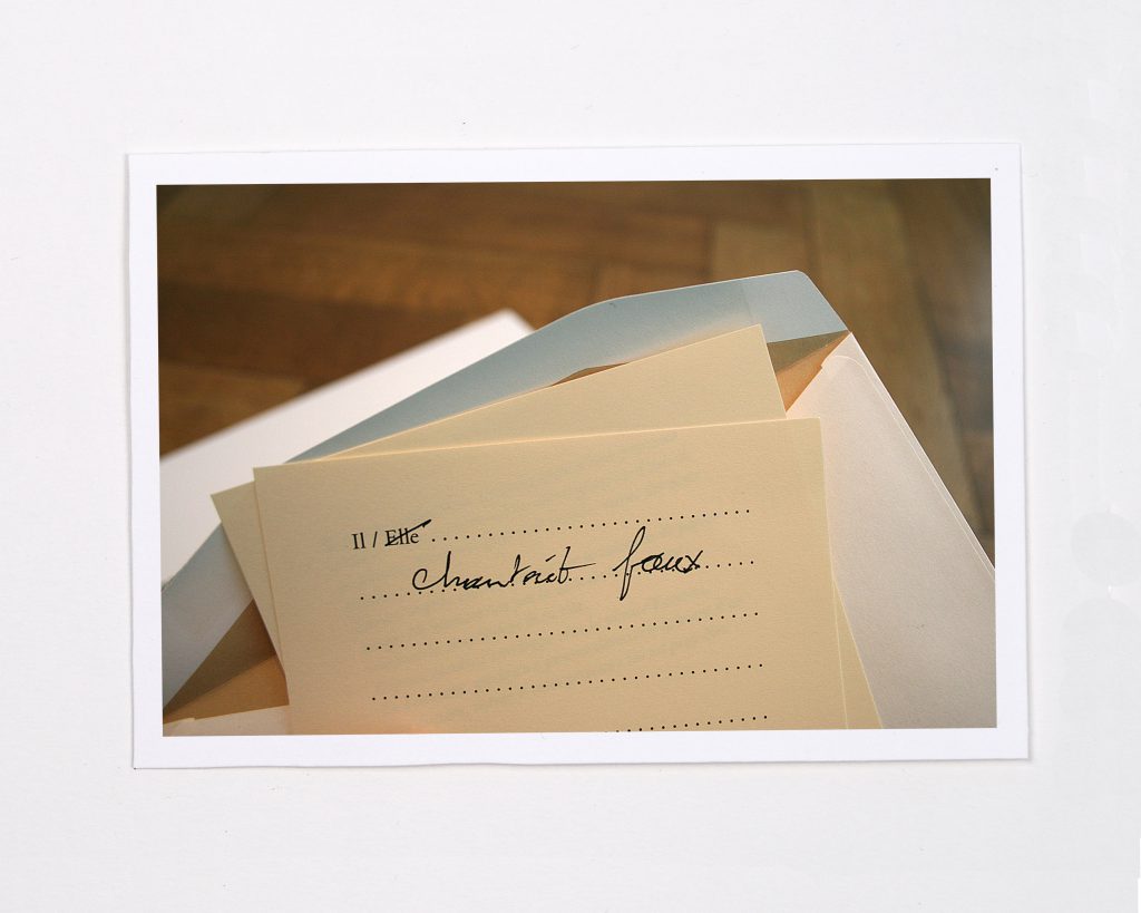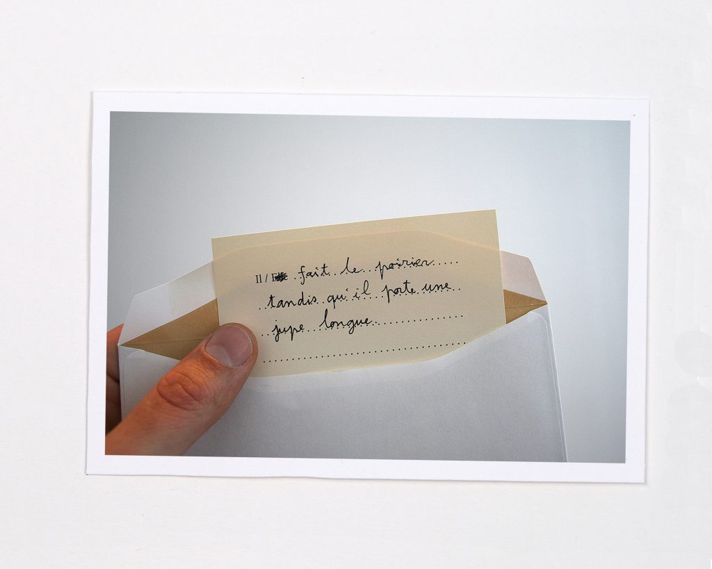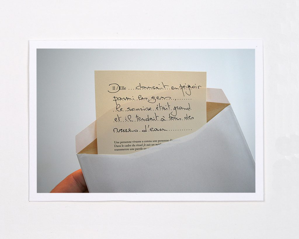Placez sur la feuille de gauche une ou plusieurs enveloppes contenant le message suivant : « Si vous le voulez, souvenez-vous d’une personne disparue. Souvenez-vous d’un de ses gestes ou d’une de ses phrases. Même un geste tout simple, même des mots banals. Ecrivez ce geste ou cette phrase sur le morceau de papier vierge. Ne mentionnez pas le nom de la personne : nommez-la simplement ‘il’ ou ‘elle’ . Déposez ensuite l’enveloppe à droite, sous la phrase ‘Recevez’. En l’ouvrant, quelqu’un pourra découvrir la trace d’un être disparu, même si cette personne lui est peut-être inconnue. Au désir, vous pouvez aussi ouvrir une des enveloppes déjà remplies. »