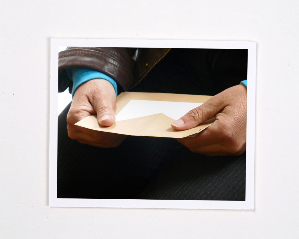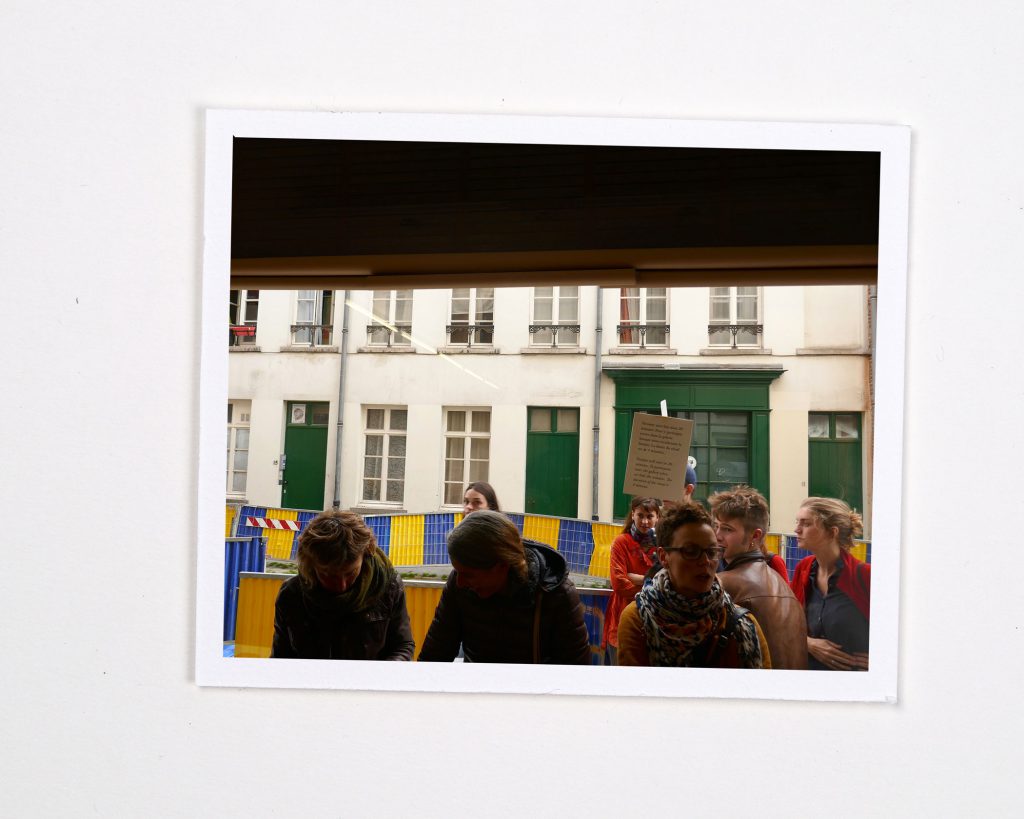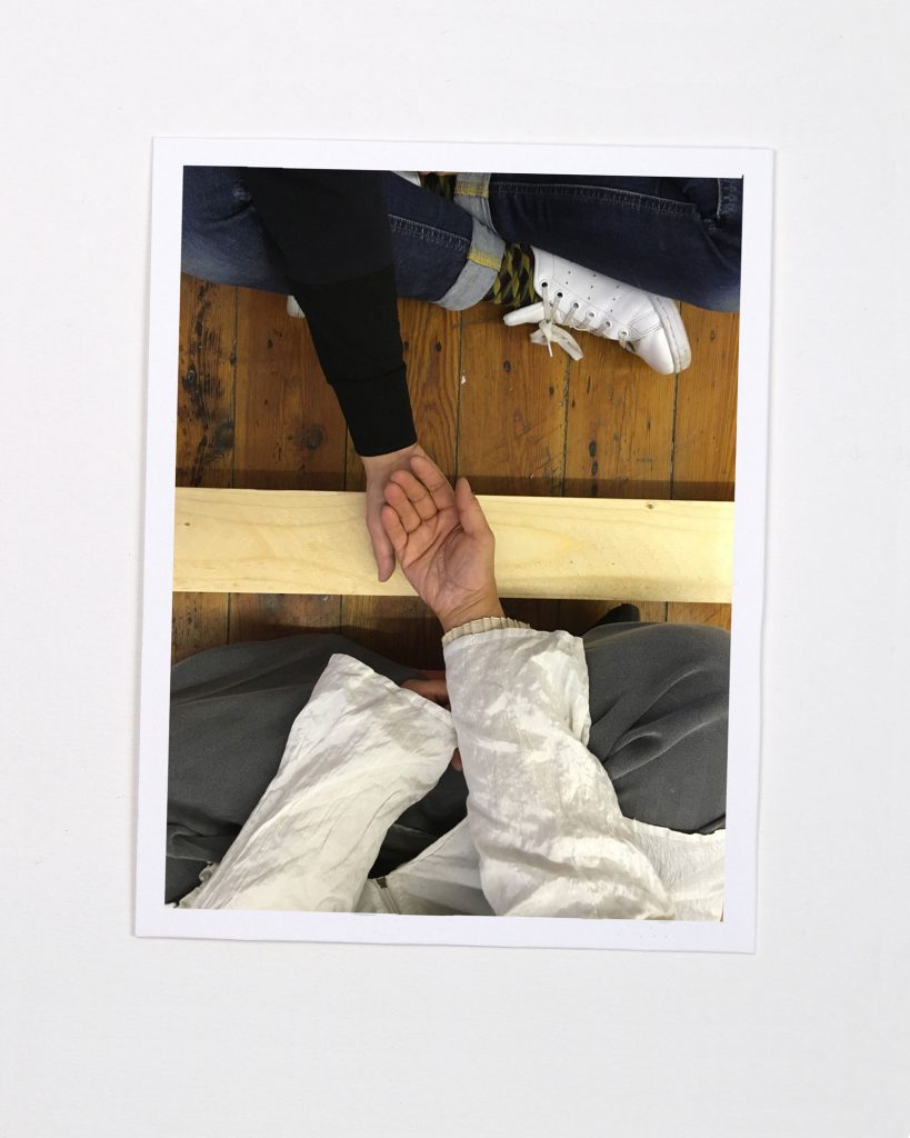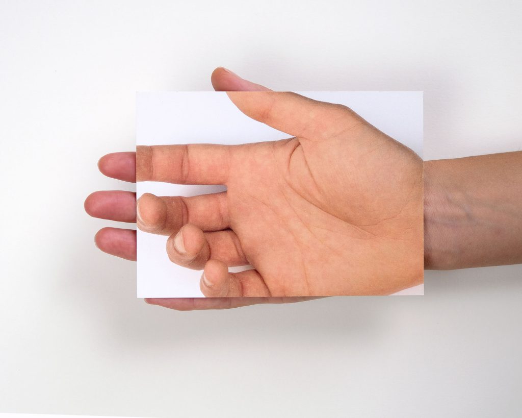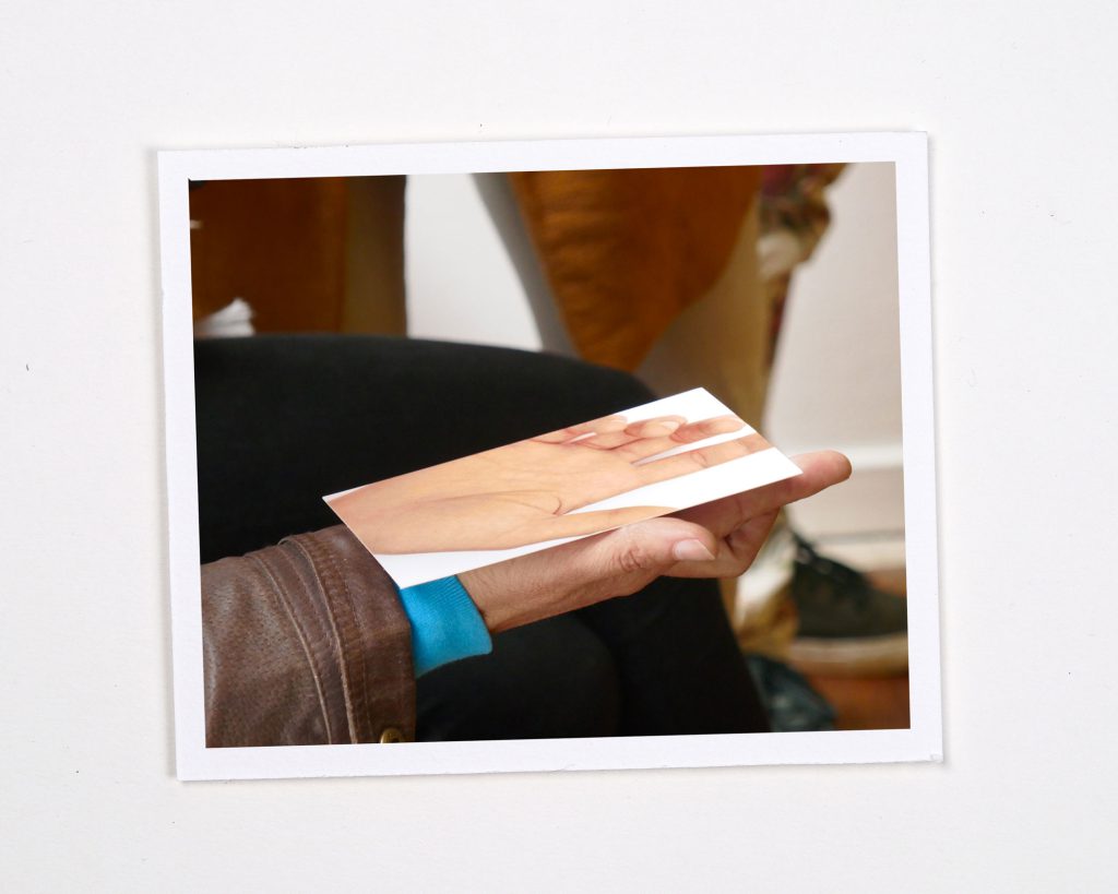 Le carton d’invitation est une photographie d’une main à l’échelle 1/1, de sorte que chacun.e peut la poser sur sa main. L’installation est seulement constituée d’une table pour mains. Cette table est recouverte d’enveloppes contenant le message suivant : « Rassemblez un nombre pair de plus de 3 personnes. Demandez-leur de garder le silence et les yeux fermés. Installez la moitié d’un côté, mains droites posées paumes ouvertes vers le ciel. Installez en face l’autre moitié. Une fois tout le monde installé, posez chaque paume sur la paume devant elle. Après 4 minutes, séparez les mains. Aidez chacun à gagner la sortie. Dehors, proposez d’ouvrir les yeux. Personne ne saura dans la main de qui, pendant 4 minutes, il aura posé sa main. »